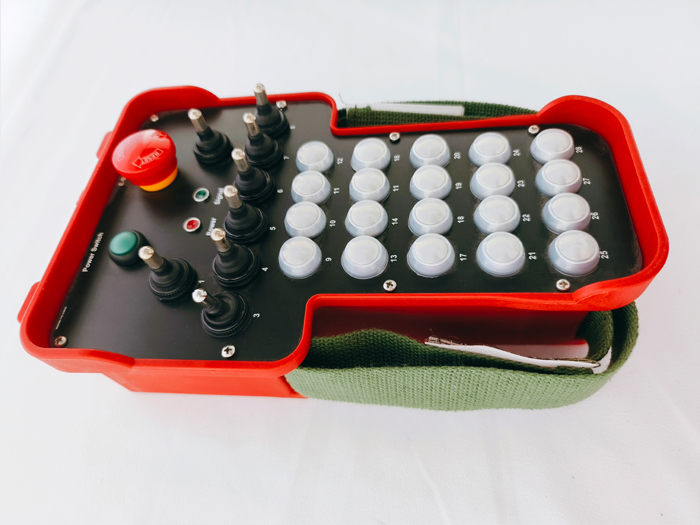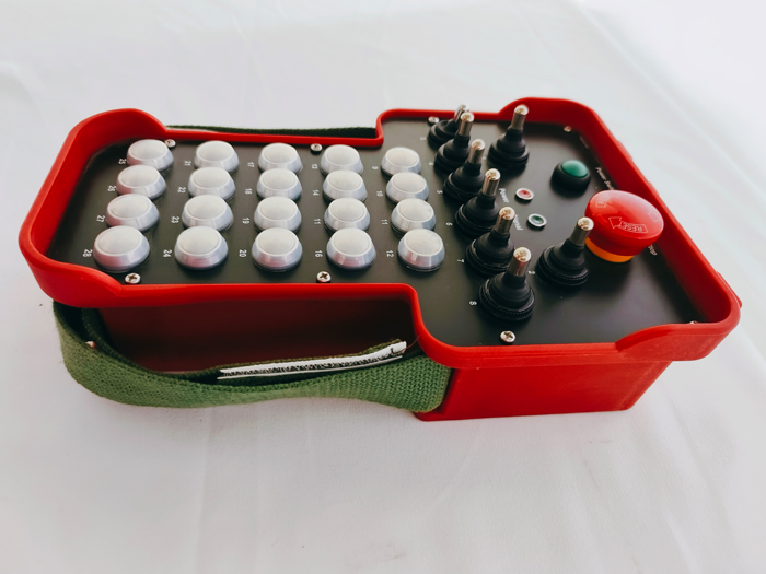 20路22路24路26路40路44路48路52路工业无线遥控器基本说明:本机型具备9个三位置扭子开关,4个不锈钢按键,另有启动+急停蘑菇头旋钮(发射机顶部),标注配置包含发射机和接收机两个部分,如果设计为每个扭子开关前中后三位置,中间设计为零位不对应输出,前后2位各自对应接收器端1路输出,4个按键设计为每个按键对应1个控制回路输出,如此则9个扭子开关实现18路开关量控制+4个开关量控制=22路开关量控制回路。22路控制功能,是标准的应用方式。如果有2个扭子开关设计为每个对应2个控制位,即为前开后关类型功能,则总的控制回路即为7*2+2+4=20路。如果有2个扭子开关前中后三个位置,每个位置均对应1路输出,则总控制回路为7*2+2*3+4=24路控制。如果有3个扭子开关对应3路控制则可达成26路功能控制输出。