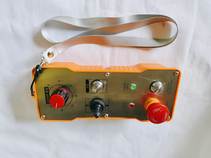 2路开关量1路模拟量调速工业遥控器,1个三位自复位扭子开关,标识为上下直线箭头,1个调速旋钮(调速/SPEED),常规增大减小标识(不带中文),“使能(ENABLE)”按键1个,启动(START)、急停(STOP),电源指示灯(POWER)、信号指示灯(SIGNAL);